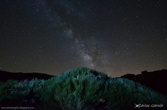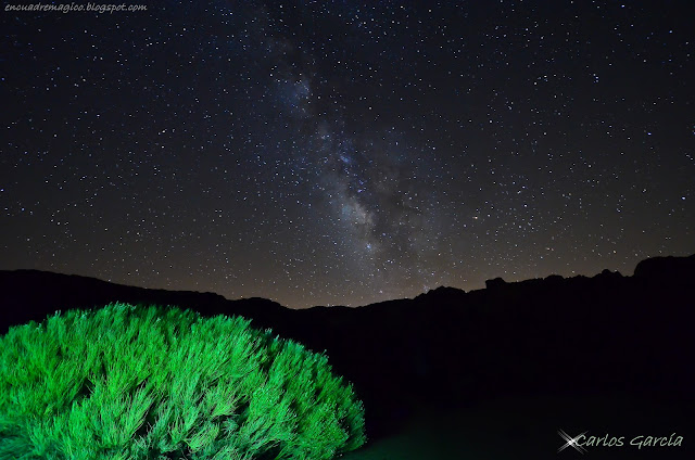 En el encuadre fotográfico de arriba realizado en el Valle de Ucanca en el Parque Nacional del Teide en Tenerife, aparece el cielo nocturno estrellado con la Vía Láctea, y en primer plano una retama a la que dí color con una linterna led con filtro verde.
