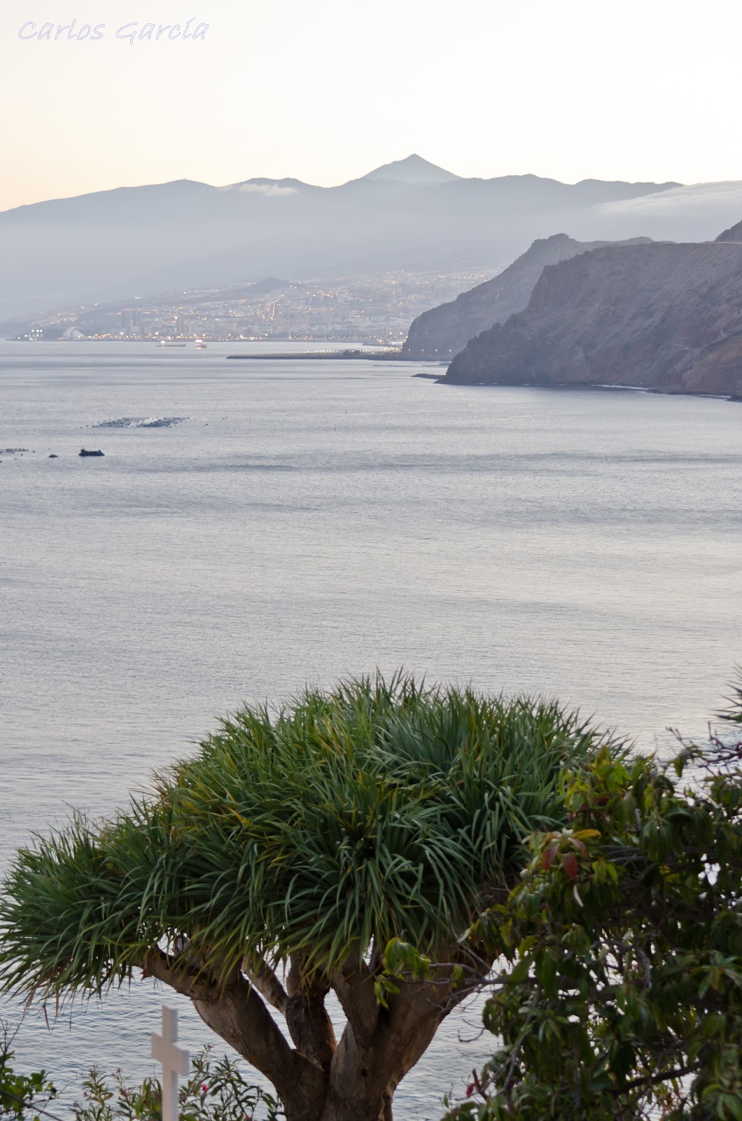 En esta instantánea tomada desde la parte alta del cementerio de Igueste de San Andrés se observa en primer plano un drago (árbol emdémico de Canarias), la cruz que sobresale del cementerio y al fondo Santa Cruz de Tenerife. Pero por encima se alza majestuoso el Teide.