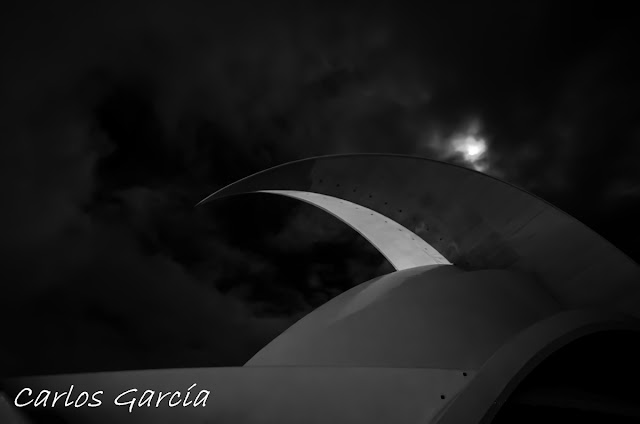 Aprovechando la inusual oportunidad que me brindaba la ausencia de iluminación del Auditorio de Santa Cruz de Tenerife y, cámara en mano, tomé algunas fotografías nocturnas del mismo. De igual manera, la luna llena y las espesas nubes ofrecían un reflejo sombrío del citado monumento.