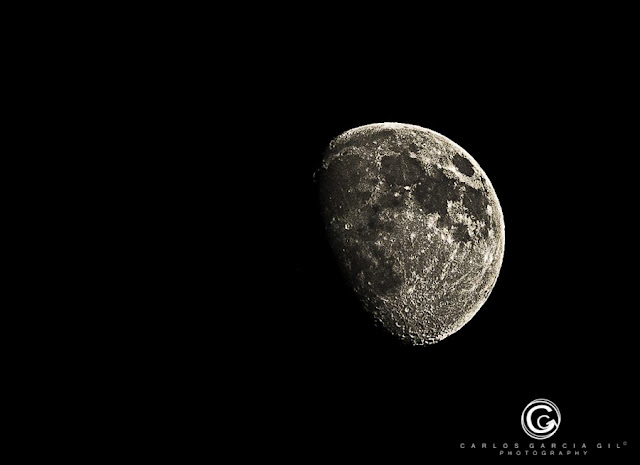 Picture of the Moon I took yesterday from my house´s window at 21 Pm, with a 70-200 Nikon lense and 2x Nikon Teleconverter. To reach more focal distance I selected a DX format on my Nikon D800 so finaly I get a real 600 mm.